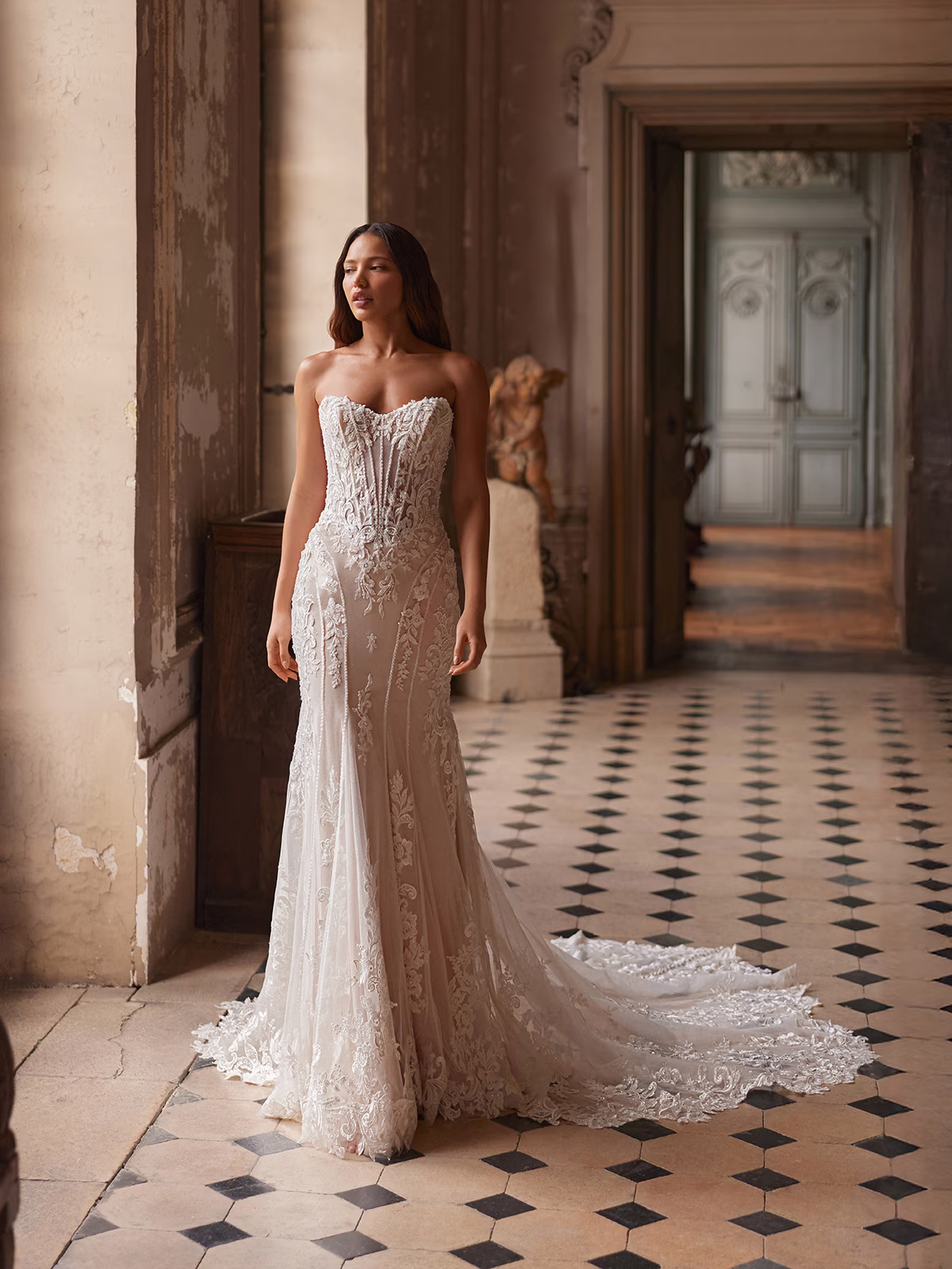 It's possible to pull off a train, but you may want to limit the length by avoiding cathedral or royal styles. If you're dead set on achieving princess vibes, you may need to get creative so you can achieve a voluminous or larger-than-life look without feeling weighed down. Don’t hesitate to incorporate fun, yet comfortable details such as detachable sleeves, illusion necklines, or intricate lace appliques.