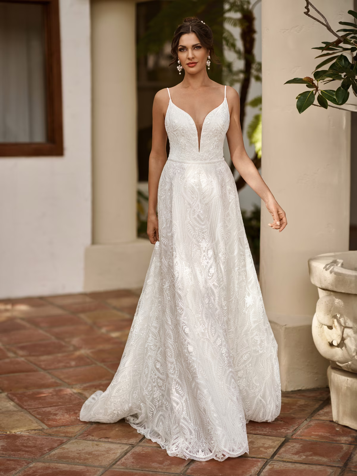Playful, yet deeply romantic, Style Valley is a dreamy A-line wedding dress that delivers a floating effect with its soft embroidered lace and sweep train. It's impossible to miss the embroidered geometric lace fabric, which are beautifully trimmed with pearl details along the spaghetti straps.