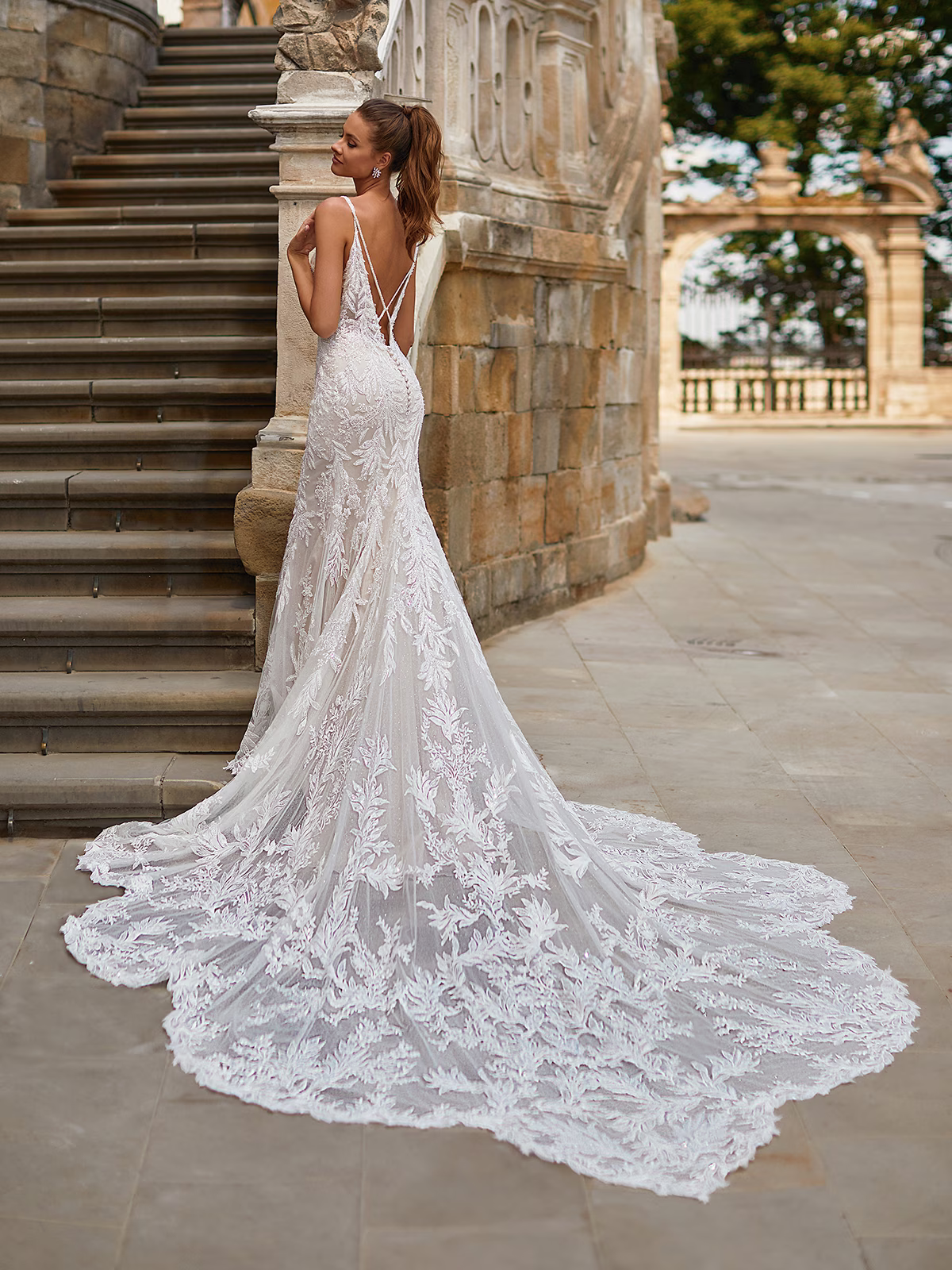 Our style PALAZZO is a mermaid wedding dress featuring double beaded spaghetti straps that wrap around and crisscross into a low keyhole back. The design includes sparkle tulle fabric, beaded floral lace appliques, and a gorgeous cathedral train. The unique double straps will make you stand out from the crowd and give you some support with the sexiness of the open back.